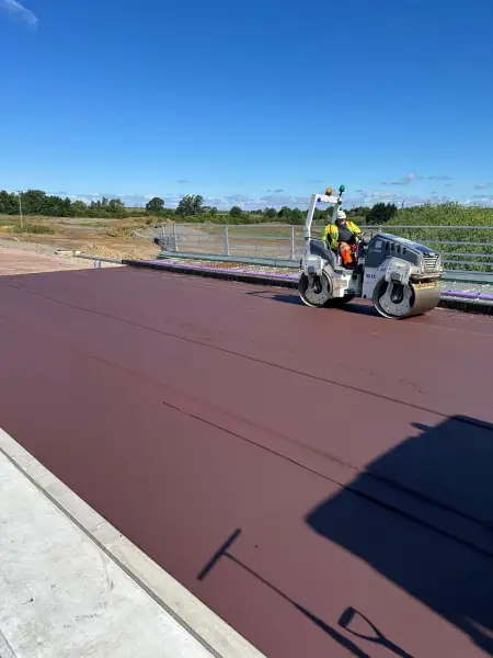 News JUNE 2024 - TOWCESTER Swipe Carrying out surfacing works at Towcester and machine laying red sand carpet to bridge deck. Back To List